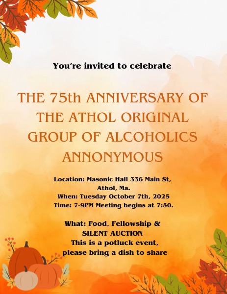 7P - 9P Athol Original 75th Food at 7pm, meeting 8pm. See flyer (Map) |