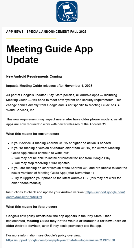 Google has updated its policies for apps on its Play Store which impacts Meeting Guide for older versions of Android, as outlined below.
