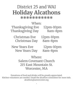 Wednesday December 24 12-10pm and Thursday December 25 8am-8pm. For inquiries email alcathon@aaworcester.org
