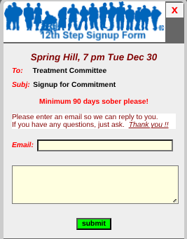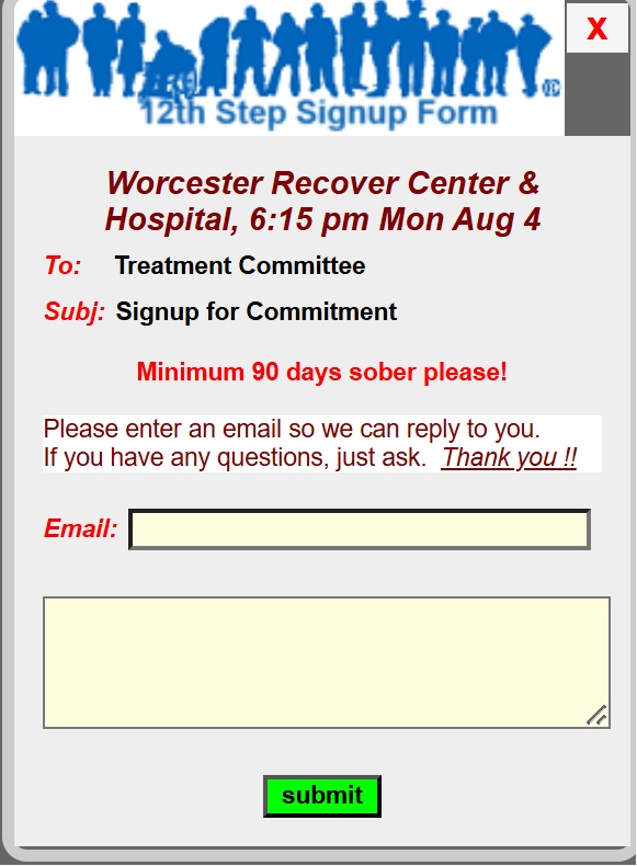 The Treatment Calendar page shows treatment commitments. We rely on AA members and groups to take commitments and carry AA's message to the still-sick and suffering alcoholic in a treatment setting.