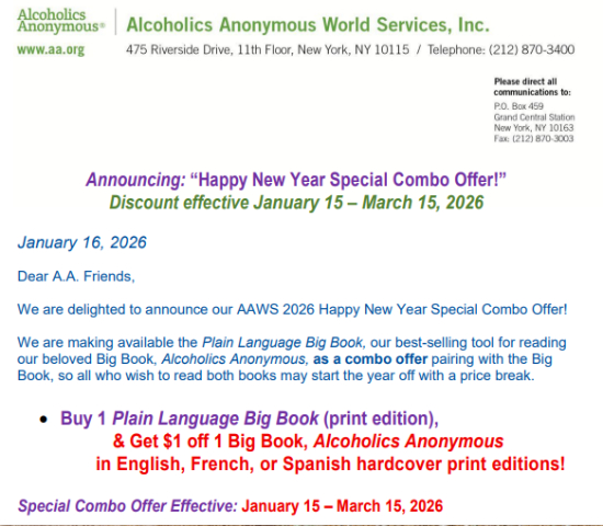 AAWS Price Increase AnnouncementPrice increase goes into effect February 1st 2026. ... (more) Thu Feb 5 District Meeting (Hybrid)District meeting 7pm Thursday February 5, in-person, phone or Zoom. ... (more) Wed Feb 11 Harvard Catacombs AnniversryWednesday February 11, 7-9pm. ... (more) Tue Feb 17 Leominster BBSS AnniversaryLeominster BBSS 28th Anniversary Tuesday February 17 6:15-8 pm. See flyer for details. ... (more) Feb 20-22 Northeast Regional A.A. Service AssemblyHosted by Area 28. Holiday Inn By The Bay, Portland Maine. See ... (more) |
