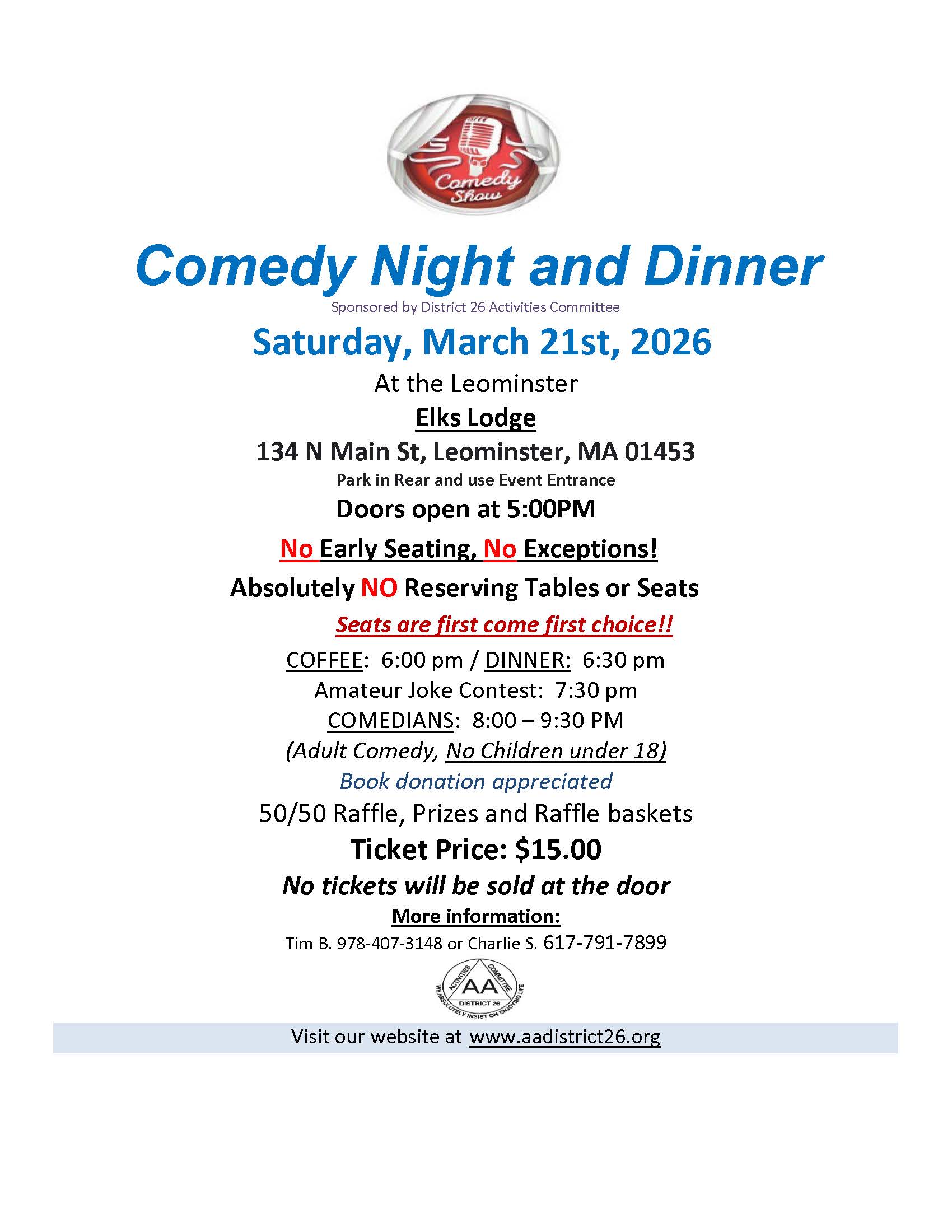 Annual Comedy Show | Sat March 21stAnnual comedy show Saturday March 21. See flyer for details ... (more) Thu Apr 2 District Meeting (Hybrid)District meeting 7pm Thursday April 2, in-person, phone or Zoom. ... (more) Mon Apr 6 Leominster Original Meeting at 7As of Monday April 6, the Leominster Original group is meeting 7-8 pm at ... (more) Sat Apr 11 District 23 RoundupHosted by District 23, lunch + dinner included. ... (more) Sun Apr 12 Preconference Area AssemblyArea 30 preconference assembly Sunday April 12, 10-4 pm. ... (more) May 16 Gardner Saturday Nite AnniversarySaturday May 16, 5-9 PM. 53rd anniversary.  ... (more) |