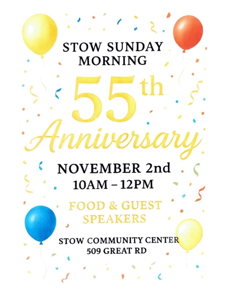 Stow Sunday group 55th anniversary. Coffee & food at 10am, guest speakers to follow. Stow Commun ... (more)