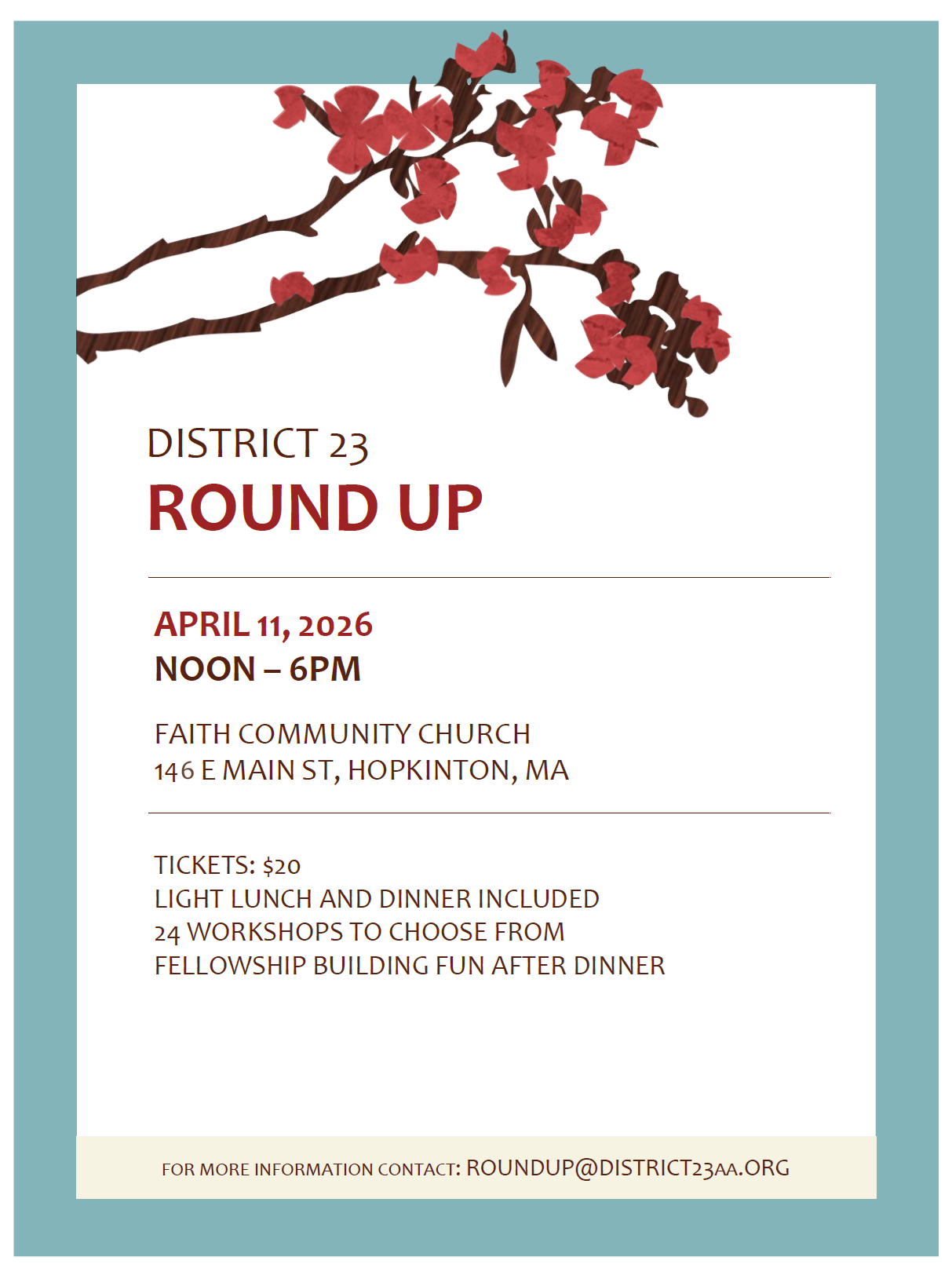 Hosted by District 23, lunch + dinner included. Faith Community church, 146 E Main Street Hopkinton. See flyer or contact Roundup@district23aa.org